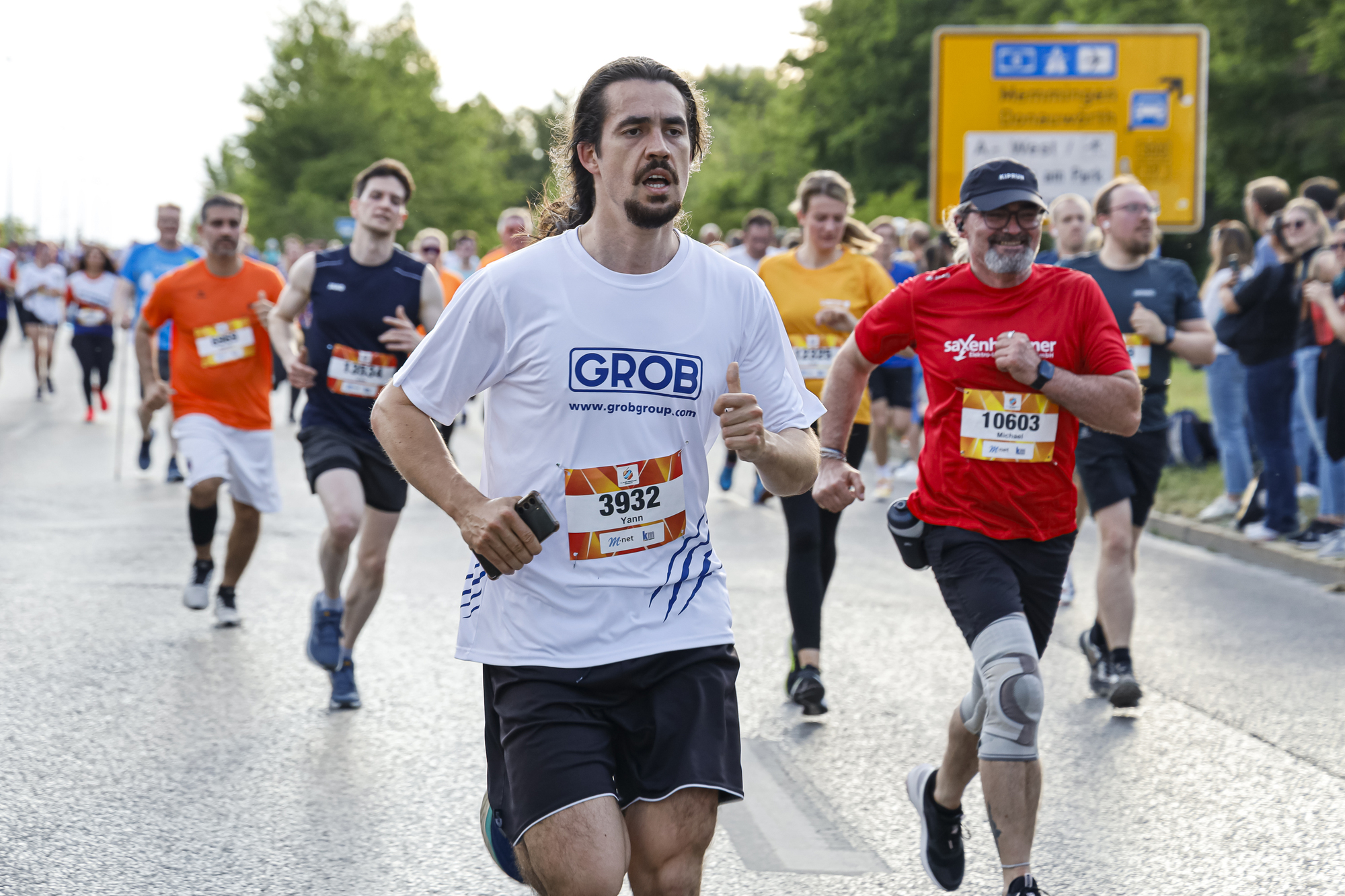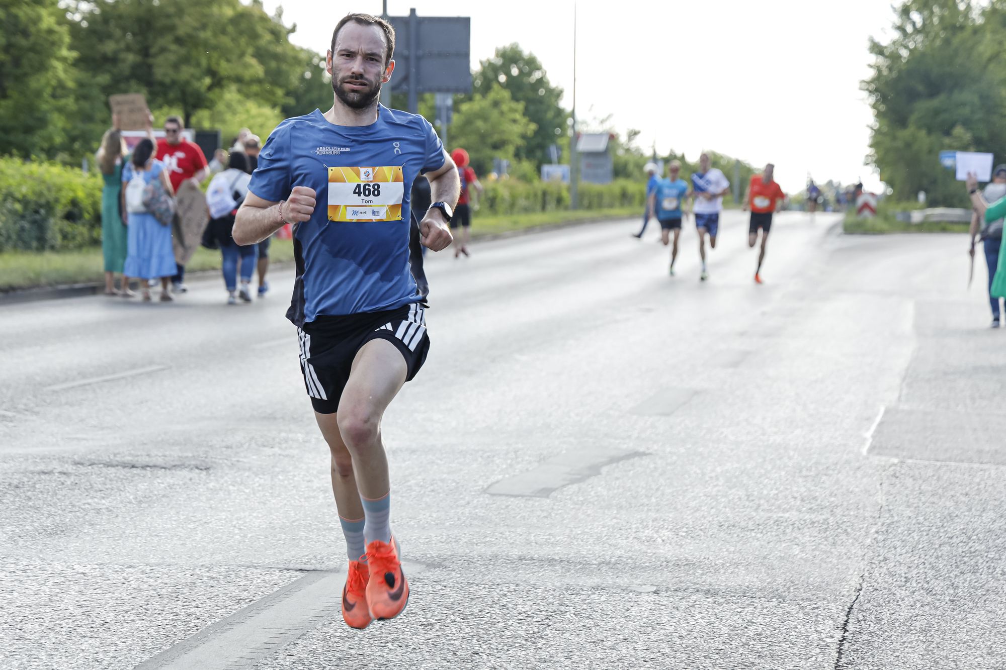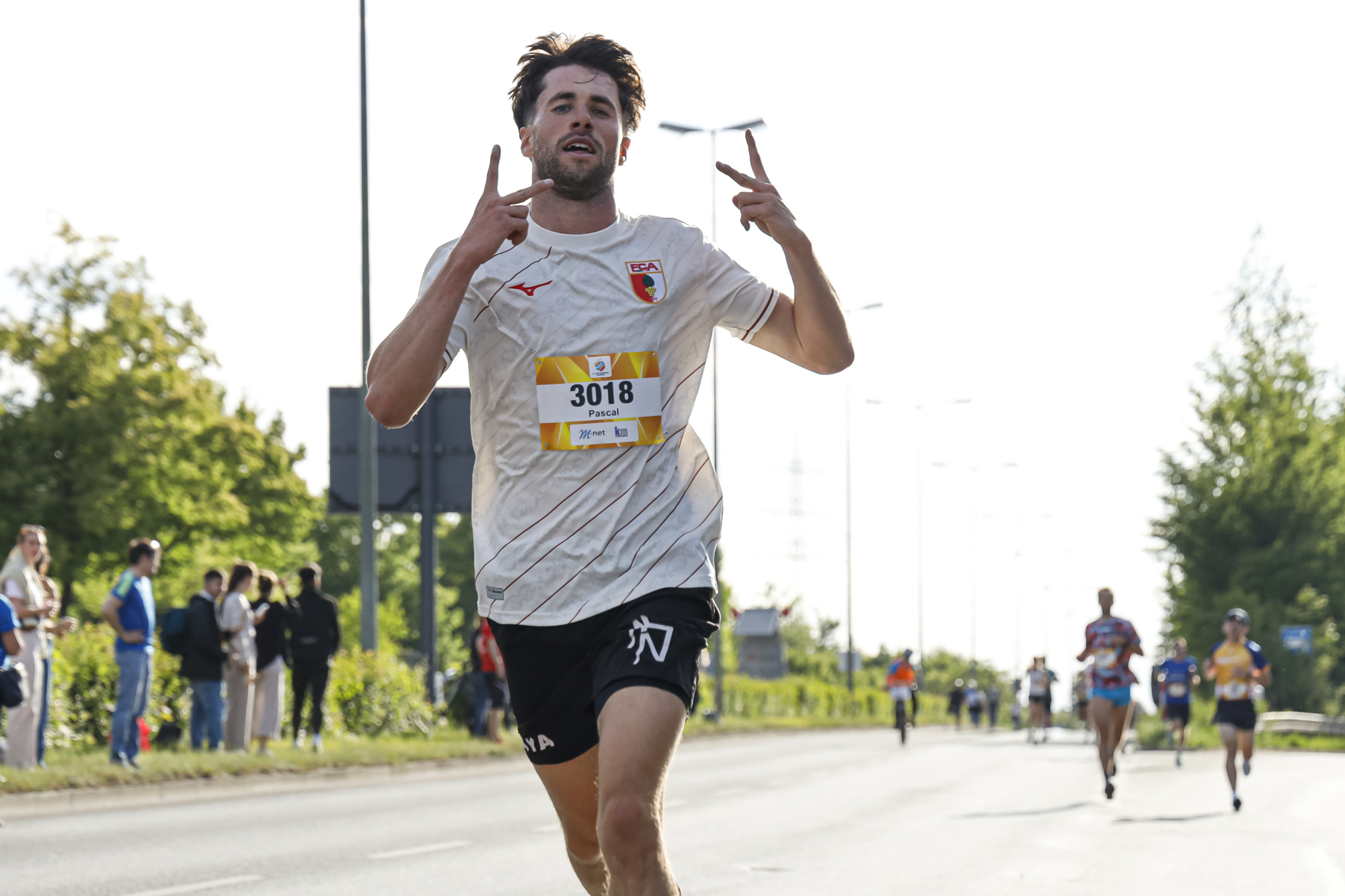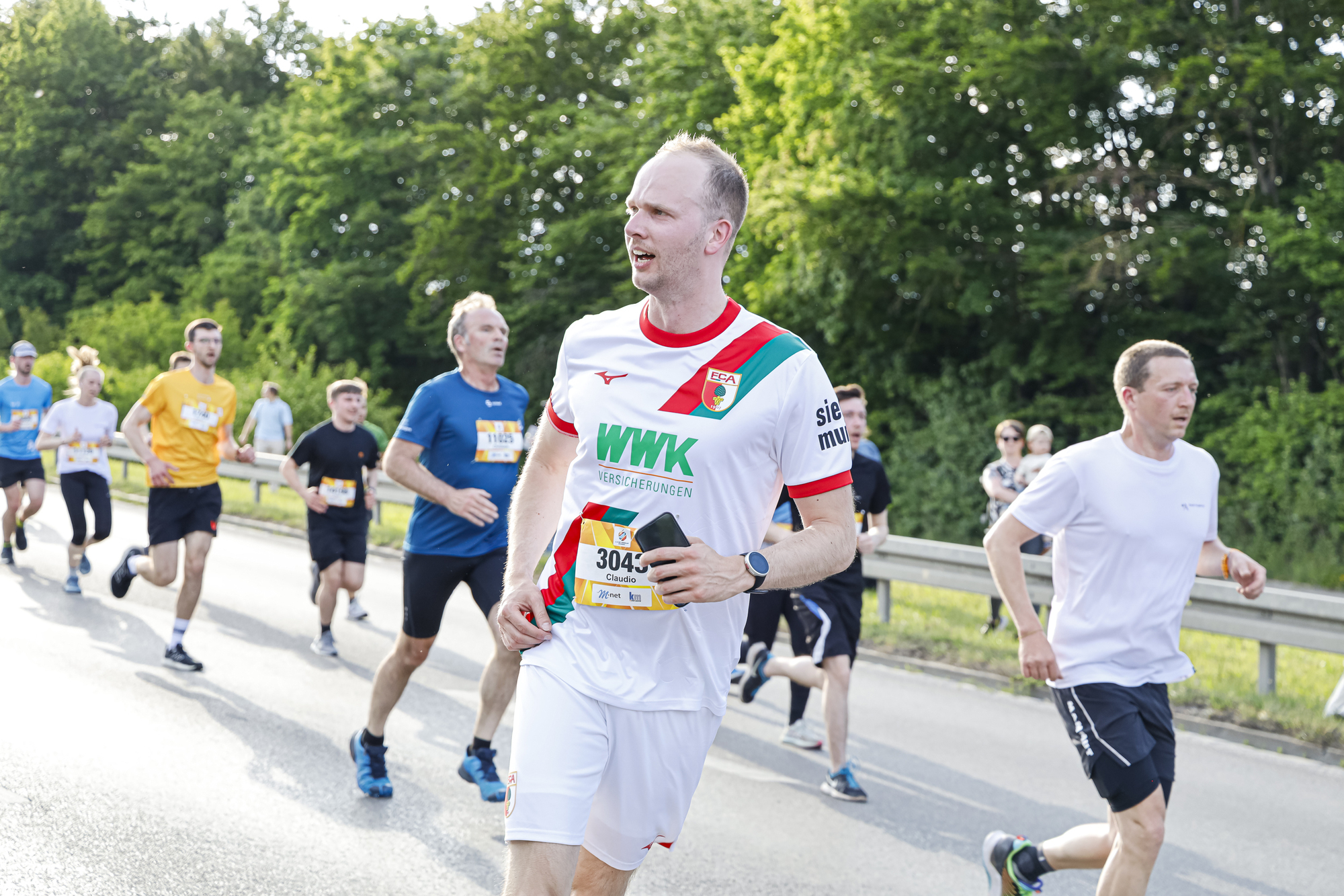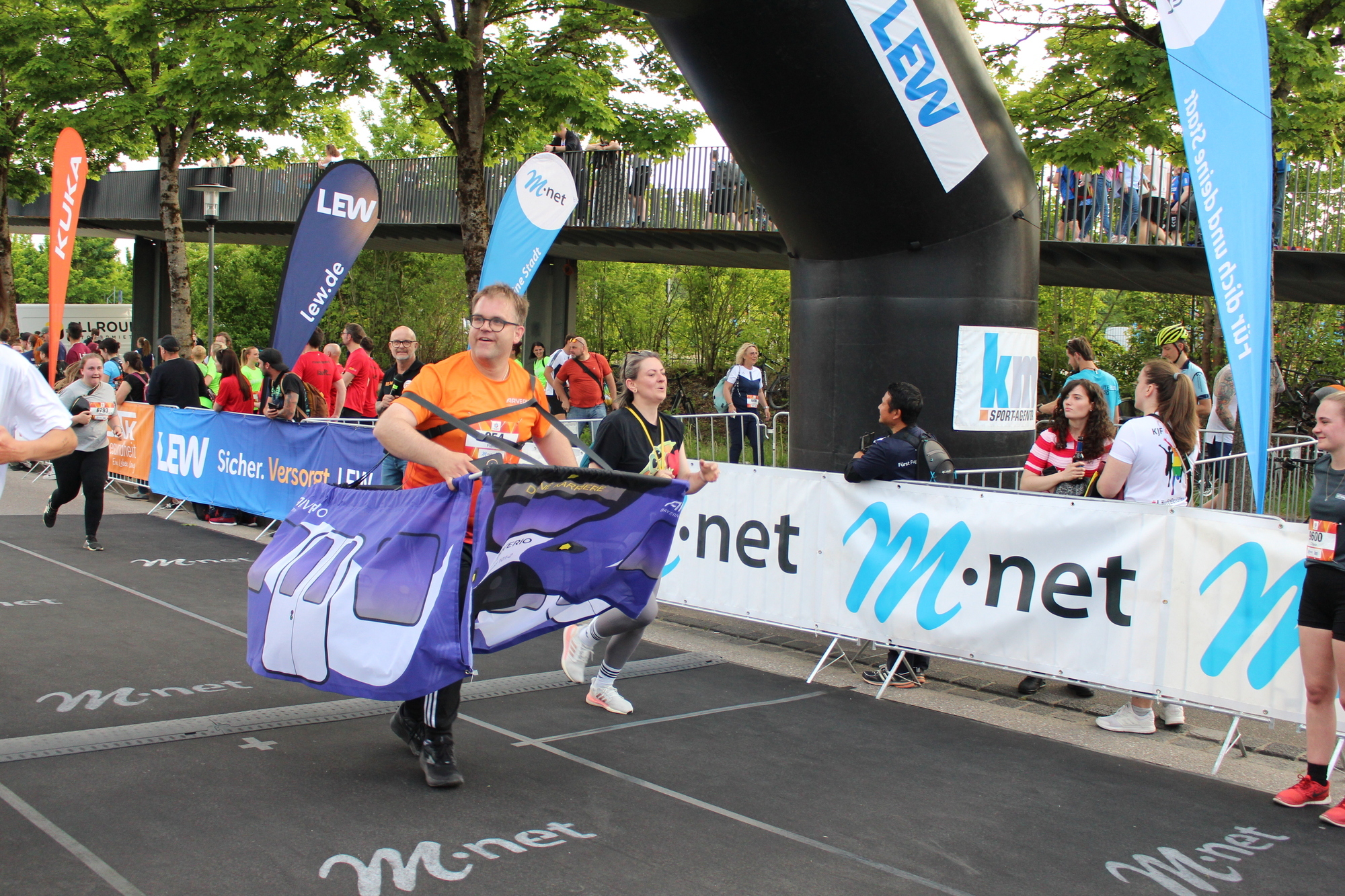 Auf der Strecke von 5,3 Kilometern ging es von der Messe über das Univiertel nach Göggingen und wieder zurück. Dabei wurden die Teilnehmenden von Bands und Zuschauern entlang der Strecke bejubelt und angefeuert. Neu war in diesem Jahr ein Protest des Laufteams der Wohnbaugruppe Augsburg: Mit einer Trikotaktion hat sie beim M-net Firmenlauf auf die angespannte Lage im geförderten Wohnungsbau aufmerksam gemacht. So war auf der Vorderseite der Lauftrikots der Slogan „Bezahlbares Wohnen für Augsburg?“ zu lesen, auf der Rückseite stand „Ohne Förderung läuft nichts“.