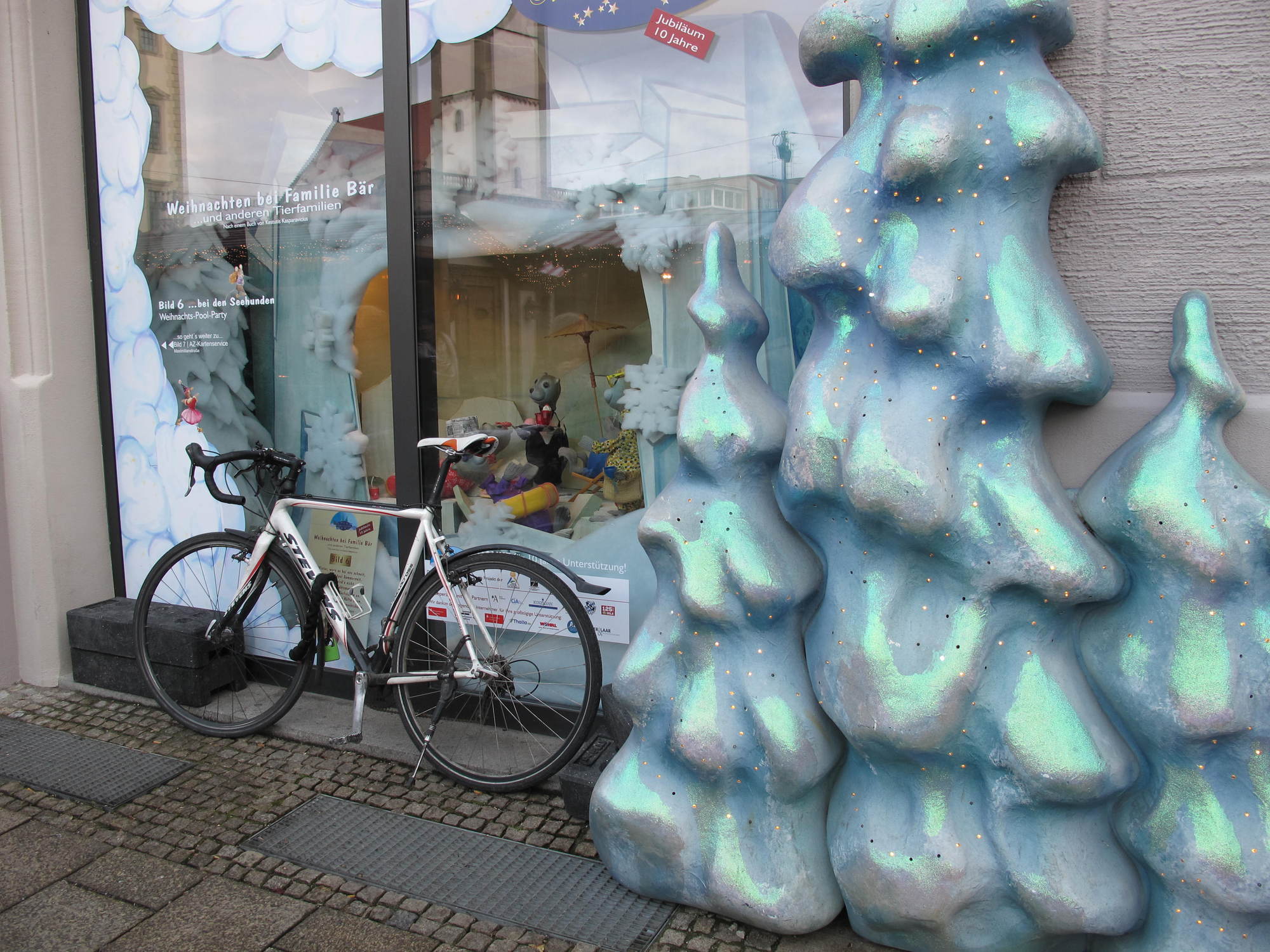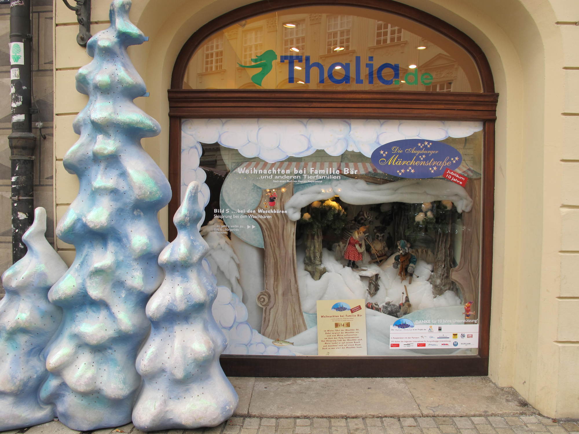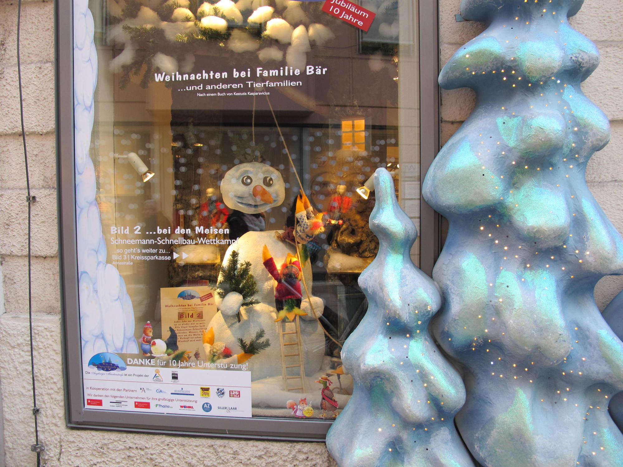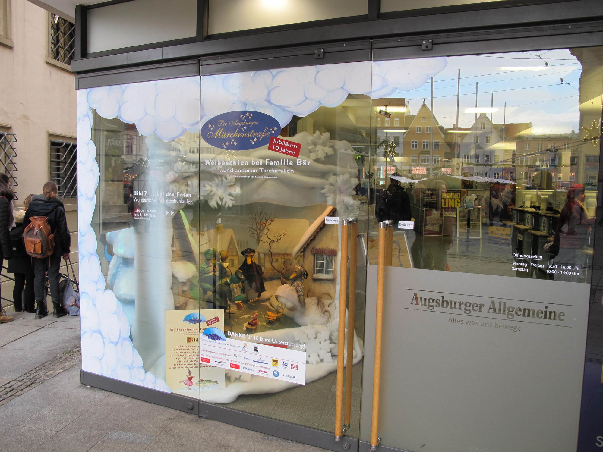 Neben dem Christkindlesmarkt lockt in der Adventszeit auch die traditionelle Märchenstraße in die Augsburger Innenstadt. In acht dekorierten Schaufenstern verschiedener Geschäfte können die Besucher die Geschichte „Weihnachten bei Familie Bär … und anderen Tierfamilien“ erleben. Die Märchenstraße wurde in diesem Jahr bereits zum zehnten Mal dekoriert. „Der Wettbewerb unter den Weihnachtsmärkten in Deutschland nimmt ständig zu, da Städte erkannt haben, wie wichtig die Impulse eines Weihnachtsmarktes für die gesamte Innenstadt sind. Um sich in diesem Wettbewerb zu positionieren, muss das Rahmenprogramm attraktiv sein und ständig weiterentwickelt werden“, erklärt Tourismusdirektor Götz Beck.